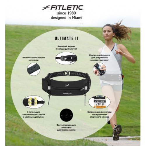 Беговой пояс, созданный для видов спорта, требующих сверхвыносливости. Первый в своем роде беговой пояс, включающий карман, петли для энергетических гелей и держатели соревновательного номера. Запатентованный дизайн позволяет захватить с собой на длительную дистанцию достаточное количество спортивного питания. Идеально подходит для триатлона, длительных восхождений в гору, марафона и протяженных велозаездов. Как и все пояса Fitletic, Ultimate I надежно фиксируется на самой широкой части бедер, не сползает и не смещается во время занятий.